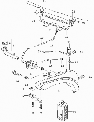 16. Should be three bolts and pull it off the gromment (toward the front of the car). Since you have headlight washers there will be two pumps and the various hose to disconnect. When you replace it make sure you get the right tank as the one for cars with headlight washers is slightly larger (996.528.701.00).