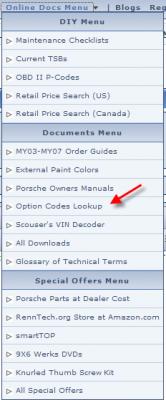 6. We have added in the option code lookup tables for the MY2007 GT3 (997) and the MY2007 TT (997). You can lookup option codes on all models from the drop-down menu (Online Docs Menu).