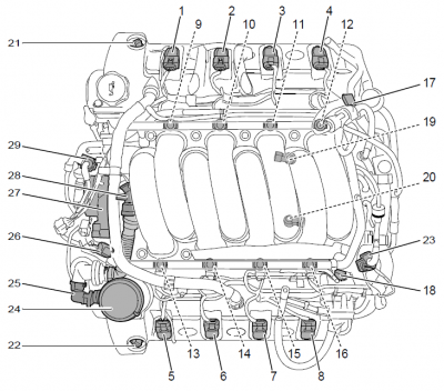 Cylinder Order (engine is turned 180 degrees for Boxster/Cayman) Cylinders 1,2,3 = bank 1 Cylinders 4,5,6 = bank 2 DME Sensors 1 - Mass air flow sensor 2 - Engine temperature sensor 3 - VarioCam valve 4 - Ignition coil 5 - Tank venting valve 6 - Secondary air pump 7 - Throttle potentiometer 8 - Idle speed air control valve 9 - Injection valve 10 - Knock sensors 11 - Hall-effect sensors 12 - Engine compartment temperature sensor 13 - Oil temperature sensor 14 - Resonance flap7 points