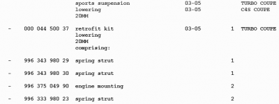 4. Next time it would be very helpful if you please give us the country. The factory installed options for that VIN (only) are: I029 I211 I242 I697 IX46 tiptronic selector lever in aluminium/leather IX54 stainless steel tailpipes IX71 instrument dial painted/aluminium look finish IX98 handbrake lever in aluminium/leather IXCC IXCB IXCA IXJ4 leather cover for ignition lock surround IXSA painted sports seat backrest IXSC porsche crest embossed in headrest IXTR IXV1 defroster trim in leather M061 version for great britain M071 eu country version M130 control and indications in english lettering M197 stronger battery M249 tiptronic transmission M265 automatic anti-dazzle interior mirror with rain sensor M266 automatic anti-dazzle door mirror M271 door mirror -aspherical- driver's side, electrically adjustable and heatable M274 vanity mirror illuminated M273 door mirrors, electrically adjustable and heatable M288 headlamp washer M339 all-wheel drive M335 automatic seat belt, 3-point, rear M342 seat heating system, left/right seat M376 sports seat, backrest shell, right M375 sports seat, backrest shell, left M410 18-inch turbo 2 wheel M425 rear window wiper M424 cd compartment M436 3-spoke airbag steering wheel M432 steering wheel with tiptronic control M441 radio preparation M466 rear foglamp, right M476 porsche stability management (psm) M492 headlamps for left-hand traffic M539 mechanical seat-height adjustment, left M536 alarm siren and tilt sensor M534 theft security system M540 mechanical seat-height adjustment, right M563 side airbag M566 front fog lights, white M567 windscreen tinted, upper part darker coloured M562 airbag, driver's side and front passenger's side M573 air conditioner M571 activated charcoal filter M581 center console, front M602 raised stop lamp M601 xenon lighting system M620 electronic accelerator M635 parking assistent M657 power assisted steering M650 electrical sliding roof M659 on-board computer M651 electric window opener M661 stricter emission-control concept M685 rear seats, split M680 -my 01 digital sound package my 02- sound system bose analog M692 cd autochanger "porsche " M936 seat covers, rear, leather M983 seat covers, front, leather M981 leather equipment without seat covers