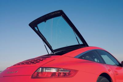As with the previous Targa model, the most striking feature of the elegant sports car is the large, sliding-glass roof and glass rear hatch, which blend sleekly into the classic 911 lines while providing the Targa with its own unique personality. A polished, anodized aluminum trim strip runs the entire length of the roof frame, emphasizing the 911’s classic silhouette.