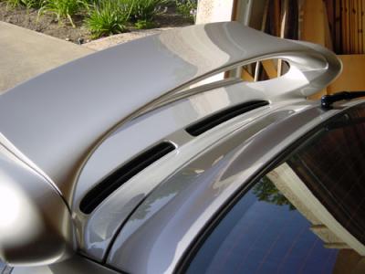 4. No, no engine cooling at all in either spoiler (that I am aware of). Here is a pic of the inside of my aerokit spoiler - note the only opening is to the air cleaner tube. The engine purge fan can cool by also bringing in outside - but only when the engine is very hot - and usually after stopping. On the top side here is what it looks like.