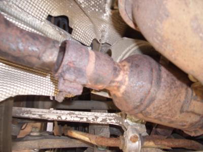 11. The bolts holding the short connector that covers the gap between the cat pipe and the silencer had broken (one has already fallen off). The short connecting sleeve had slid down the pipe leaving a gap. Sorted temporarily with £2.40 worth of jubilee clips.