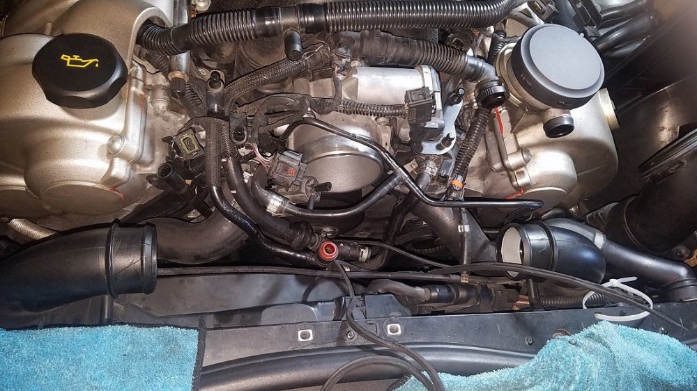 My coolant pipes were done about 4 years ago, at which time water pump was changed too. Drive belt was done too, that is about 60k miles I guess. As an update: UPDATE. Been while since touched the car. Was away for more than 2 weeks. Now got the valve cover seals done. Getting to drive belt and leak. Need advice what to remove. 3 different vent lines got broken by belt...all near front of engine, driver side, going from top under valve covers and are wrapped in silver heat protectors. Need to see how I can remove and reinstall mew ones. Also another vent line going from center of engine towards these (with valve) got broke too. here are some pics of area, wanted to get advice on what to remove to make space. Some pulleys look like have been coated with belt rubber so I need to clean then. ALSO, how would I know if a pulley is bad? Last 2 pics are zoom of pipes that need replace. you can see the silver heat protection. Those 2 plus a vent line going from them to a valve center of engine. Maybe more once I get in there. Water pump did not seem leaking but need to pressure test after removing intake. Dont see any looseness yet. Thanks. Here are pics.