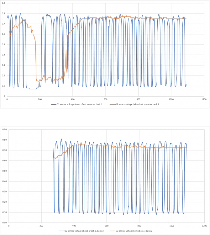 2002 C2, 95k miles, original exhaust and O2 sensors. A few months back the CEL went on, Durametric says P0420: Porsche fault code 40 - Cat. conv. efficiency bank 1. CEL has stayed on so I investigated further. Pre- and post-cat O2 sensor voltages shown in attached charts, upper chart for Bank 1 and the lower for Bank 2. Warmed up the system at idle, then throttled up to 2.5 - 3k three times, two short, one long, during which time all sensors went near zero. It looks like Bank 1 (upper chart) post-cat sensor is showing a problem while Bank 2 (lower) looks fine. (I started capturing Bank 2 after Bank 1) Also for a few years there has been a little rattling on the driver's side exhaust which I've suspected is a failing cat, but the exhaust system has not been recording any faults until now. After having read a few related threads, it seems fairly certain that the Bank 1 cat is failing, perhaps with a loose element that reduced cat performance after the third throttle bump in the charts below. I'm leaning that way because it appears the sensors are all reporting data at about the same rate, oscillating when expected, except for post-cat Bank 1's sensor which begins the capture looking like it is largely reporting correctly but ends with oscillations that shouldn't be there. There has been no perceptible change in performance, and I have over a year until the next smog inspection, so there's time. Does this information indicate a pretty strong likelihood of a failing Bank 1 cat? Or are there additional diagnostic steps I should take to eliminate other causes?