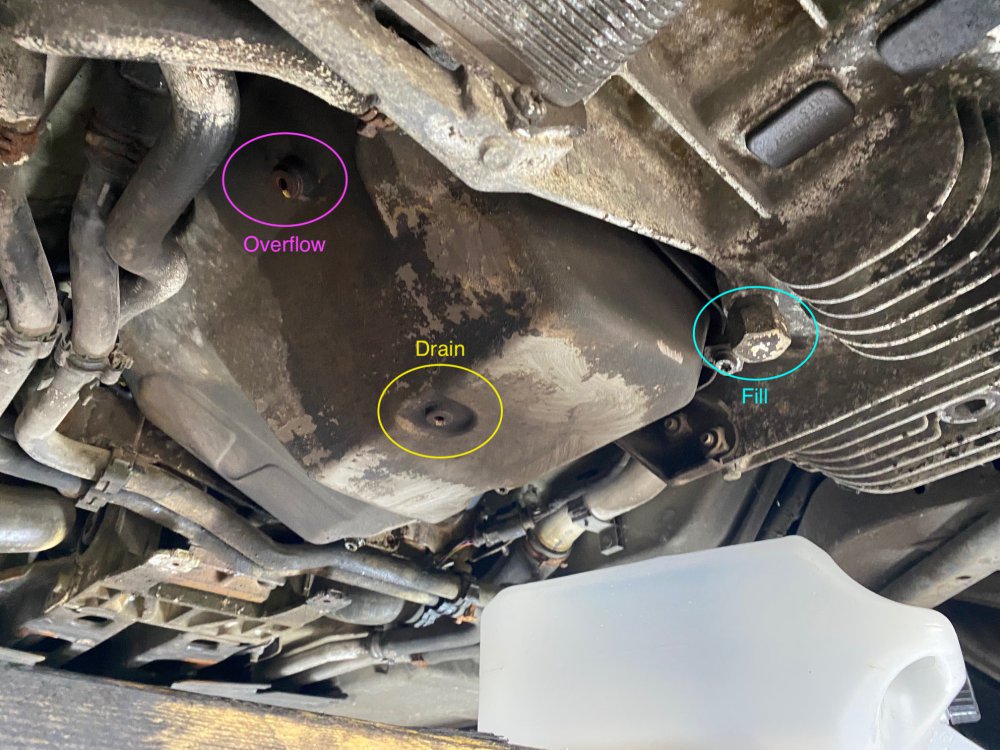 1 ) Drained the transmission oil, on the photo below I indicated where is the drain, overflow and fill plug :