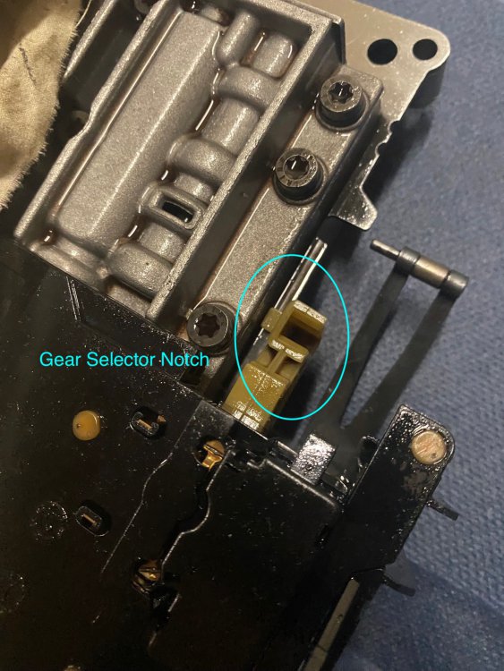 9 ) When reinstalling the transmission plate, make sure that the gear selector pin inside the gearbox & the notch on the transmission plate align ! The notched part moves forwards/backwards depending on what the gear selector is in (PRND), the pin and the notch match up :