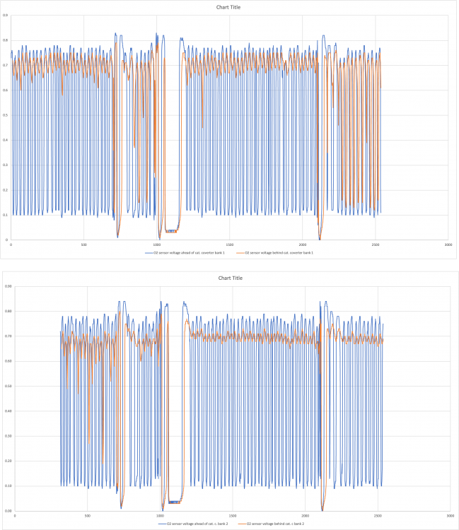 2002 C2, 95k miles, original exhaust and O2 sensors. A few months back the CEL went on, Durametric says P0420: Porsche fault code 40 - Cat. conv. efficiency bank 1. CEL has stayed on so I investigated further. Pre- and post-cat O2 sensor voltages shown in attached charts, upper chart for Bank 1 and the lower for Bank 2. Warmed up the system at idle, then throttled up to 2.5 - 3k three times, two short, one long, during which time all sensors went near zero. It looks like Bank 1 (upper chart) post-cat sensor is showing a problem while Bank 2 (lower) looks fine. (I started capturing Bank 2 after Bank 1) Also for a few years there has been a little rattling on the driver's side exhaust which I've suspected is a failing cat, but the exhaust system has not been recording any faults until now. After having read a few related threads, it seems fairly certain that the Bank 1 cat is failing, perhaps with a loose element that reduced cat performance after the third throttle bump in the charts below. I'm leaning that way because it appears the sensors are all reporting data at about the same rate, oscillating when expected, except for post-cat Bank 1's sensor which begins the capture looking like it is largely reporting correctly but ends with oscillations that shouldn't be there. There has been no perceptible change in performance, and I have over a year until the next smog inspection, so there's time. Does this information indicate a pretty strong likelihood of a failing Bank 1 cat? Or are there additional diagnostic steps I should take to eliminate other causes?