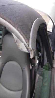 1. Hello Everyone, Edit: the car is 2005 Boxster, 2.7 manual. Recently I noticed that the driver side carpet (right where I live) is wet after a rain. After eliminating several possible explanations I learned, that the water leaks from the point where soft top, windscreen and side window come together. I have made few photos from the both sides to check for the differences. I have noticed, that the rubber tooth-like seal on the roof, which goes into the cavity of the same shape on the windscreen, is bent on the side, where leak is: Also, soft rubber seal on the windscreen on the side with the leak is a bit deformed: But I suspect, that the real cause is that the flocked rubber seal, which the side window goes into, came apart from the roof frame (I marked it on the photo because it is extremely hard to take a good picture of): On the passenger side, where there's no leak, the same seal is completely flush with the frame. Could you please suggest a way to fix the problem or a better explanation? Thanks in advance.
