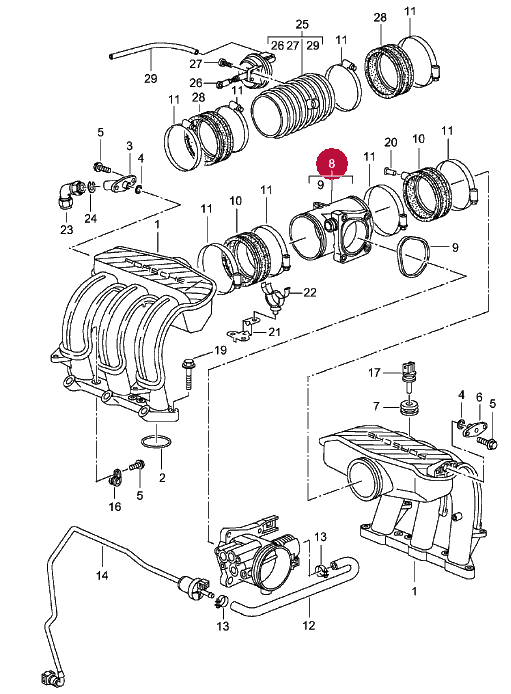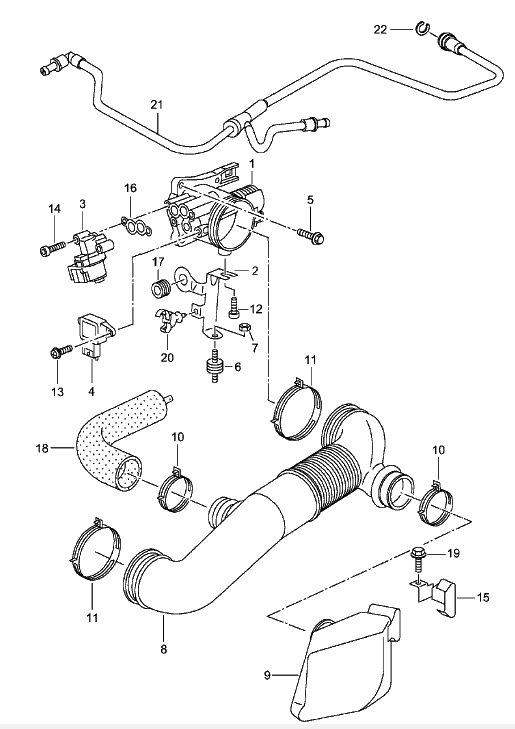 This is a very hard hose with only two ends with special locking clips on each end that is part of the hose. One end goes into the the Intermediate piece part number 99611021553 right where the throttle body bolts to. The other end goes into some type of canister. I was cleaning the throttle body and one of the locking pieces broke. No dealer or Pelican Parts people can figure the part number, I really hate to take hose off to get number, Any help will be greatly appreciated